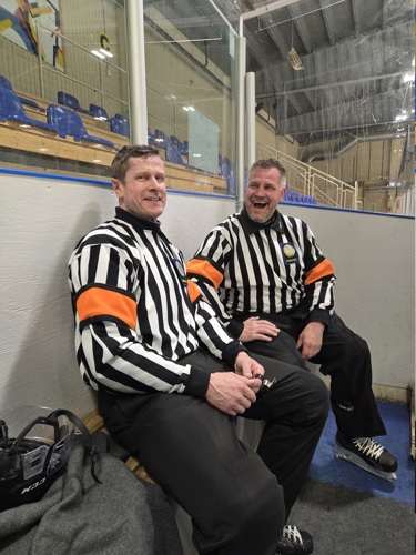 Domare Andreas Woxberg och Stefan Axelsson vilar i pausen.